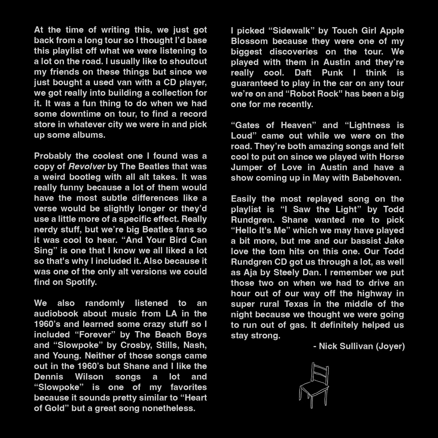 In honor of the time spent in route, Nick curated a playlist of songs derived from their van’s growing CD collection. With a mix of celebrated rockers, charming deep cuts and demos, even some songs from their contemporary companions, this playlist is a reminiscence bump for a time filled with variety, uncertainty and comradery for a band doing what they love.