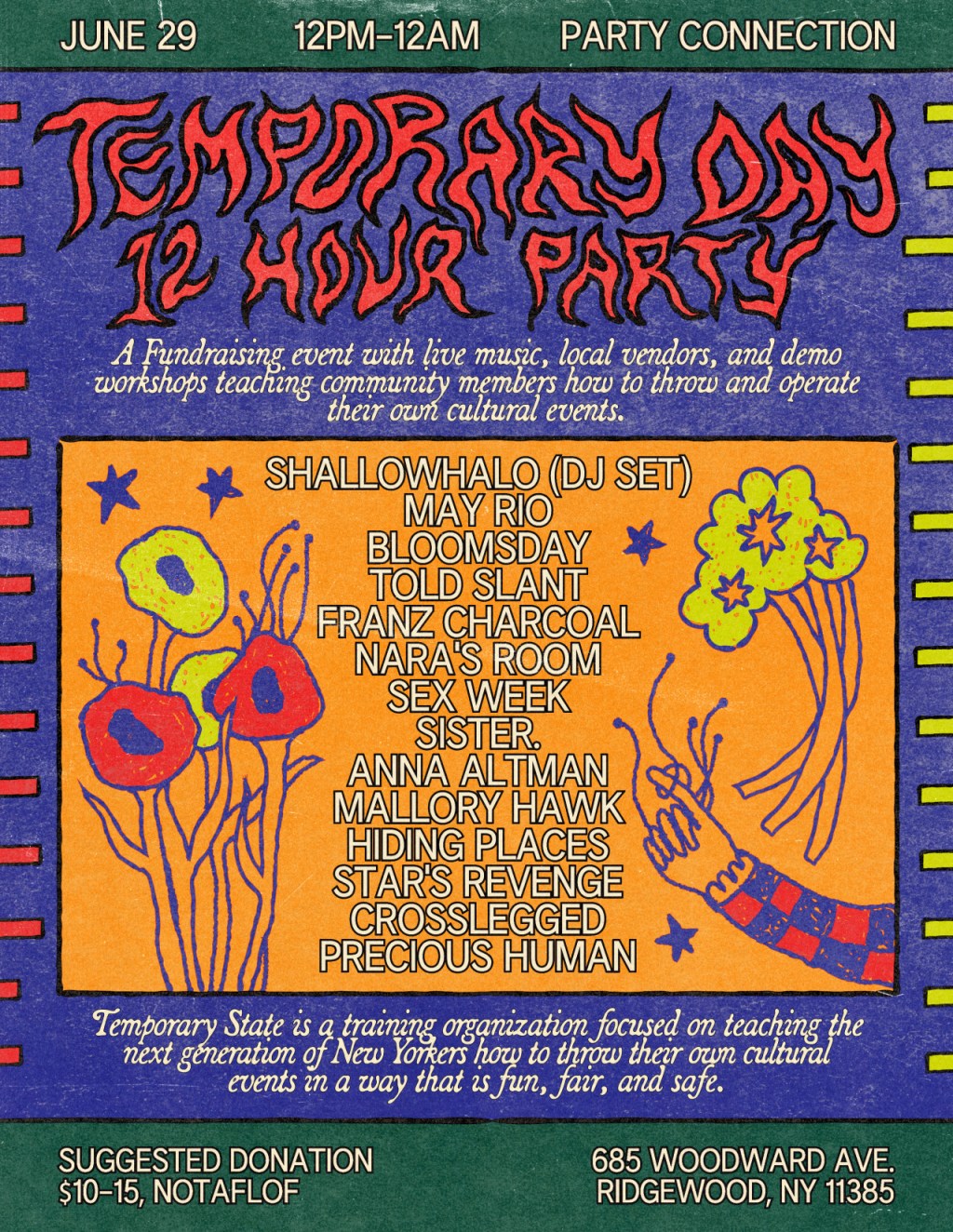As they gear up for these workshops, TSU will be hosting the Temporary Day Party, their big fundraising drive this Saturday, June 29 in Ridgewood, NY. As an all day event, the Temporary Day Party will consist of a 12 hour, 15 act show of some of New York’s best musicians, a handful of local vendors, as well as a preview to the full workshops.