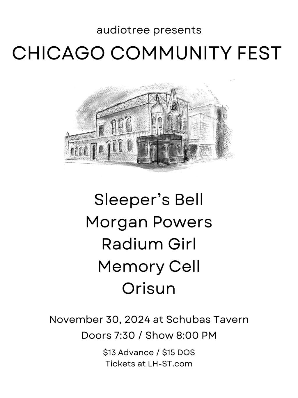 This Saturday, November 30th, Audiotree is partnering up with the surrounding community of Chicago to bring you the first ever Chicago Community Festival at Schubas Tavern. The festival will have performances by Sleeper’s Bell, Morgan Powers, Radium Girl, Memory Cell, Orisun.