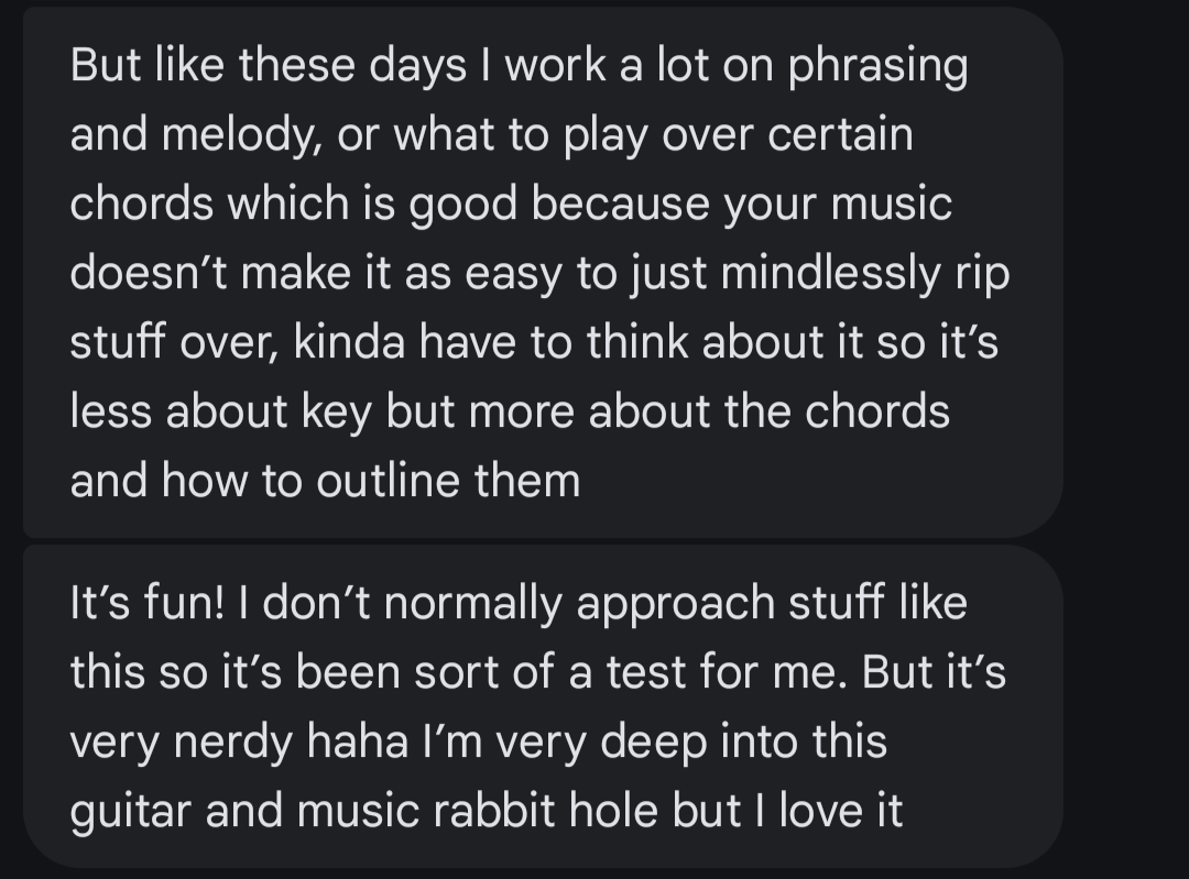 We auditioned four guitarists and asked them to learn two songs from Nurture and contribute ideas to an unreleased song to get a sense of their style. David’s ideas for the new song were what sealed the deal, and as we were really getting to know each other, this text from him was just the cherry on top: