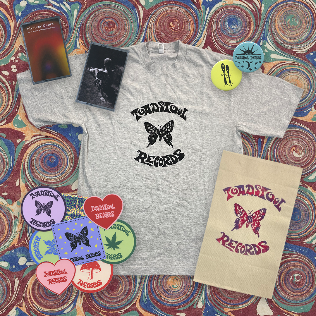 Along with this series, our friends over at Toadstool Records are offering a merch bundle giveaway! The bundle includes a bunch of stickers, cassette tapes of Love Songs & Hallucinations (2023) by Mystery Choir and Honeysuckle(2024) by Youth Large, small banner, t shirt and buttons, as well as stickers and a tote bag from the ugly hug.
