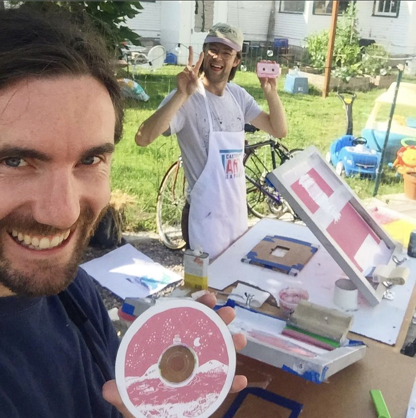 Sandy Smith: We also wanted to get into screen printing as a practice, and it was kind of an excuse to learn more in that world. Jon had done some printing stuff before but we had a couple of friends in Missoula who were incredibly talented screen printers, Max Mahn of Twin Home Prints, and then Foster Caffrey. Foster especially helped us with specifically printing on tapes, and how to translate some of the stuff to record label-specific printing, and Max is just an all-around whiz and so invaluable, keeps teaching us stuff; he is incredible because he’s really, really good at it, isn’t annoyed when we have beyond beginner questions like, okay, “I understand that’s how you’re supposed to do it, but what if we wanted to do it like really cheap and shitty in a basement, how would we do it then,” and he was even willing to help us figure that out too.
